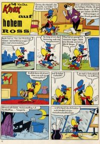 Sein Debüt gab Knox, der mit dem Raben Knickebein einen Vorläufer gehabt hatte, 1955 in Fix und Foxi 32. In seinen Anfängen war er neunmalklug, sehr eitel und war stets mit einem Frack gekleidet. Bevor er zu dem großartigen Erfinder, wie wir ihn kennen wurde, hatte er eine Vielzahl unterschiedlicher Jobs. Er als Fotograf, Astronom, Installateur, Zeitungsmacher, Hotelier, Postbeamter, Würstchenverkäufer, Detektiv … in Erscheinung.
