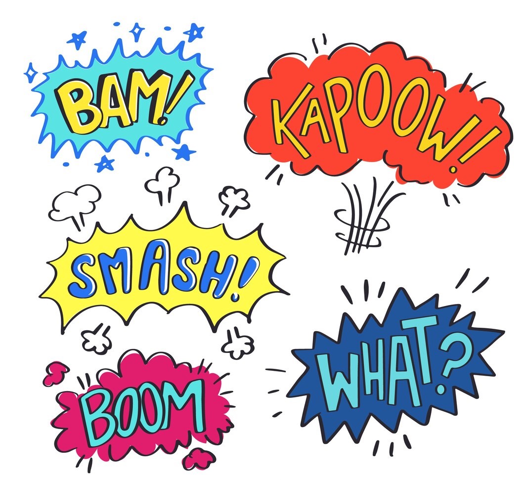 Rrrrrums, klirr, mampf, boing… Comic Fans wissen genau, was passiert, wenn sie solche Wörter lesen. Diese Wörter ahmen Laute und Geräusche nach und sind zusammen mit dem Bild sehr leicht verständlich.