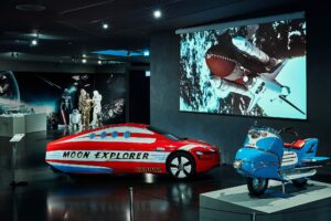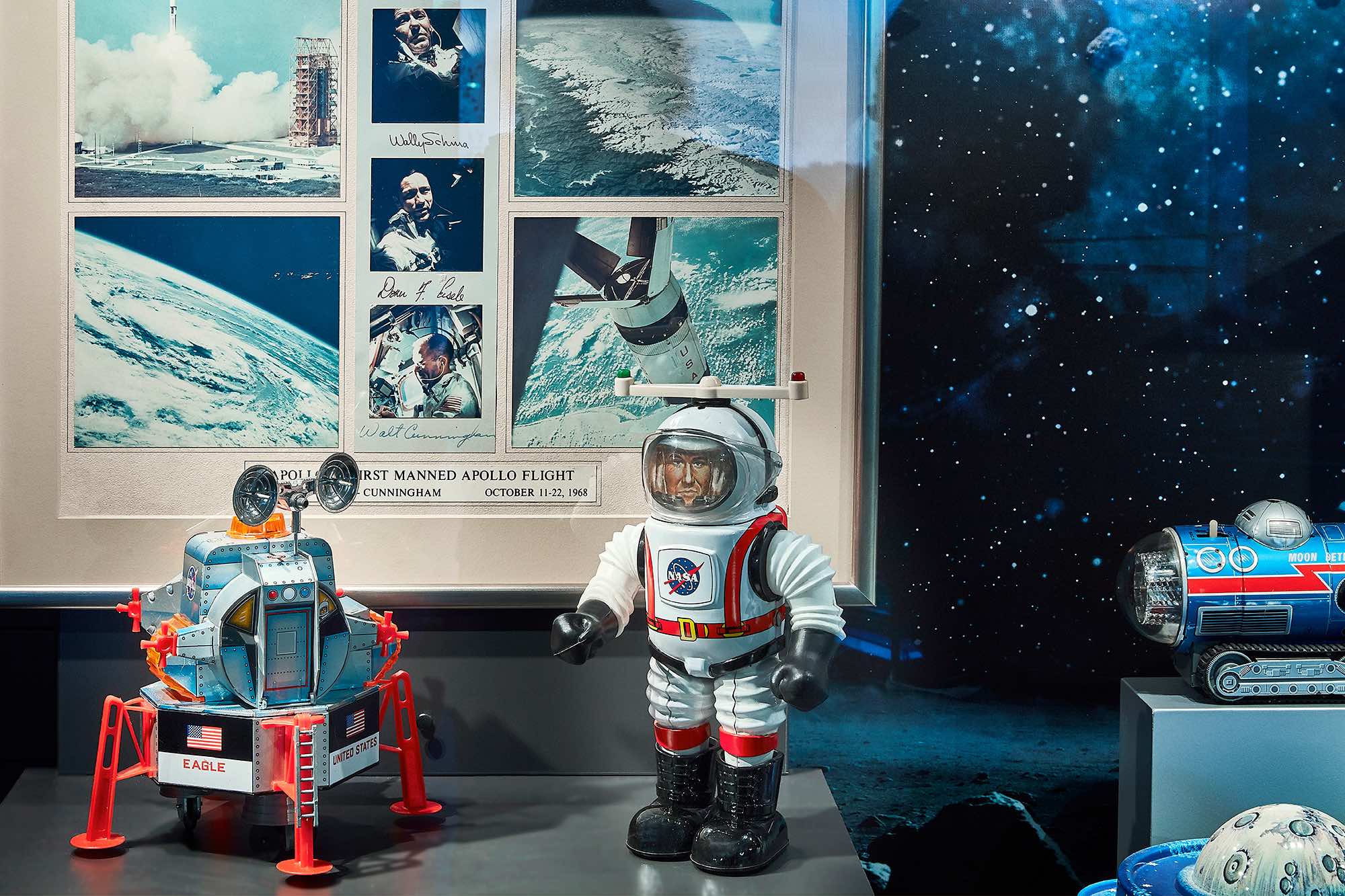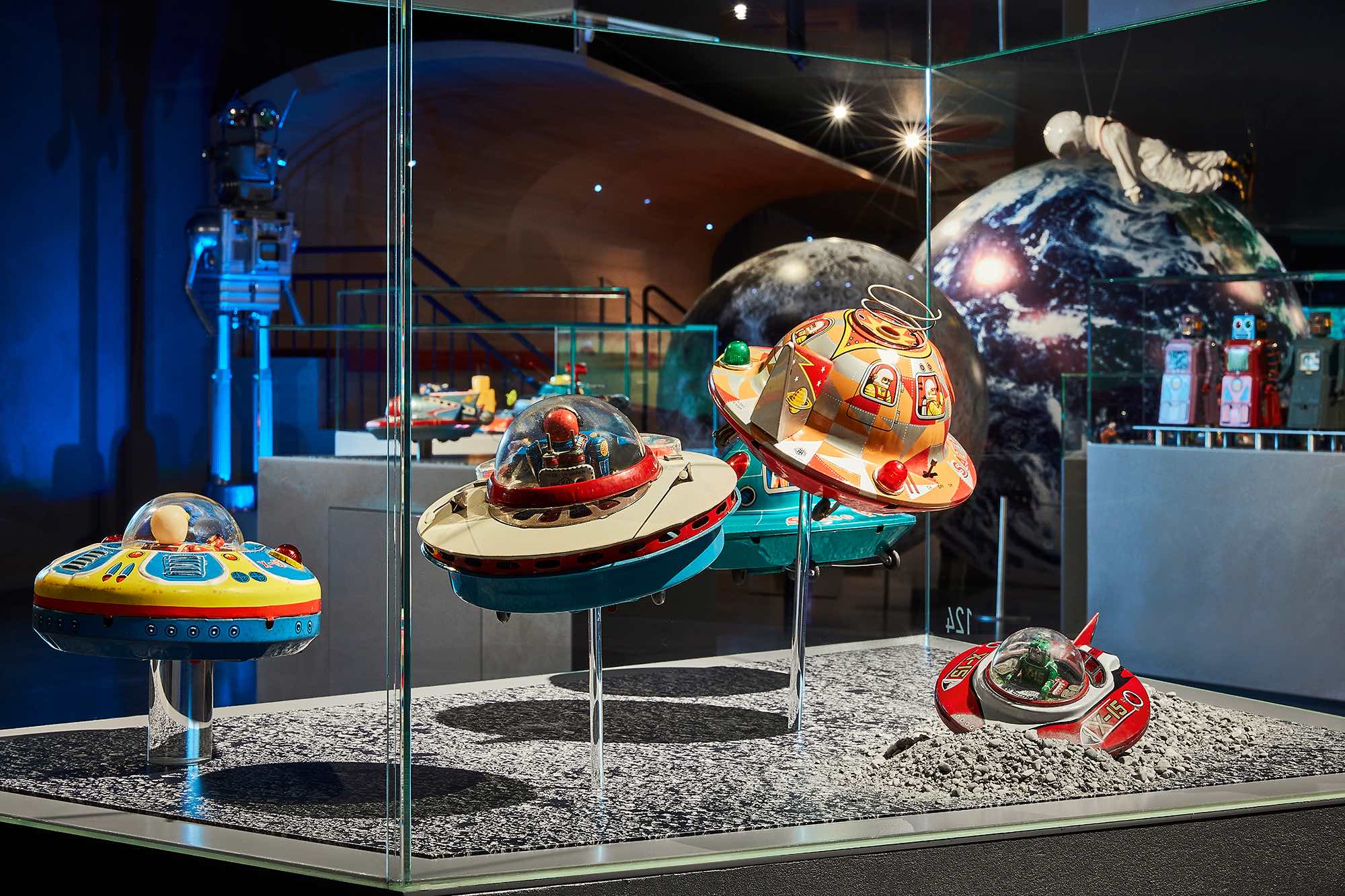 Wer weiß, vielleicht trifft man sogar ein paar Außerirdische. Aber garantiert fast alles, was sich nach der Mondlandung in den Kinderzimmern an Space Toys so tummelte, flog, bewegte und begeisterte.